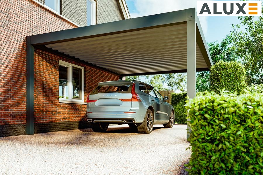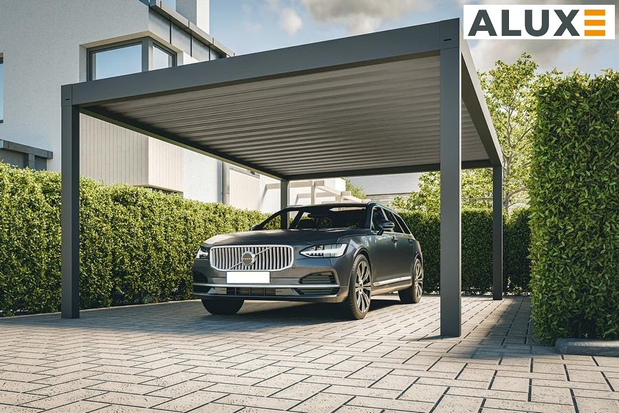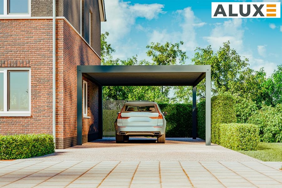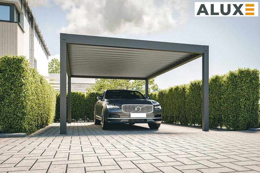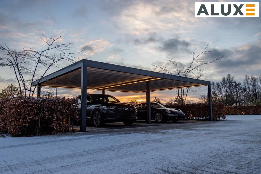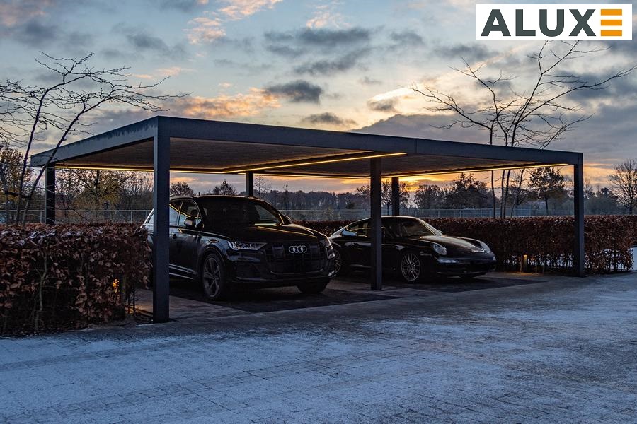 Das ALUXE Carport schützt nicht nur vor Witterungseinflüssen wie Regen, Schnee und UV-Strahlung, sondern trägt auch zur Langlebigkeit Ihres Fahrzeugs bei. Ein spezielles Vlies beschichtet die Unterseite des Carports und minimiert ein Abtropfen von Kondensat. Wir empfehlen, Ihr Carport mit einer horizontalen Beleuchtung in Rinne und Seitensparren zu versehen. Diese Beleuchtungsoption stellt eine elegante und hochwertige Lösung dar, die Ihr Fahrzeug ins rechte Licht setzt und die Ausleuchtung der Laufwege um das Fahrzeug herum ermöglicht.